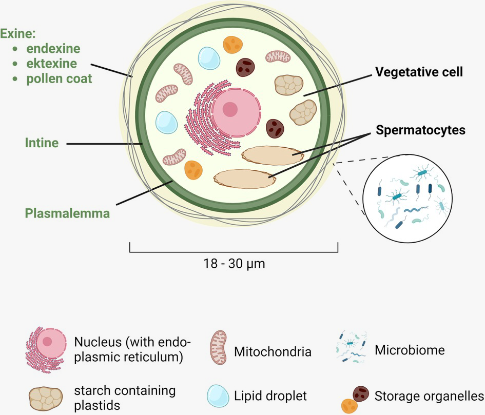 Pollen grains are microscopic, with sizes ranging from 10 to 200 micrometers. Each grain is composed of three main parts: